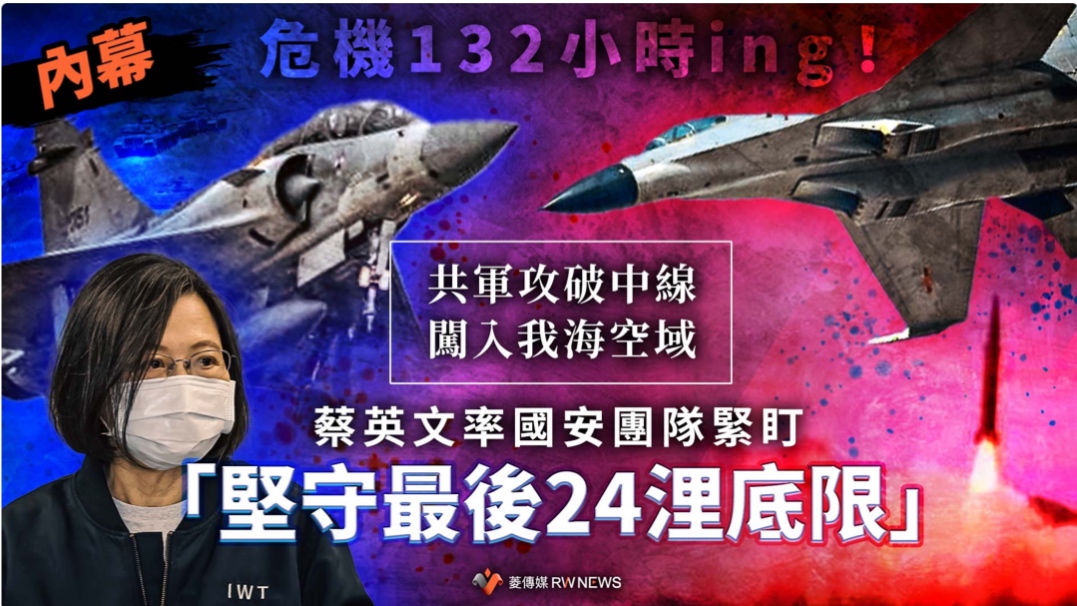 其次就是護衛台灣的海峽中線還在嗎?軍事政治消息權威的《菱傳媒》報導,[政府危機132小時ing!共軍攻破中線闖入我海空域 蔡英文率國安緊盯「堅守24浬底限」]。內文說,中共解放軍4日起開始一連5天對台灣進行封鎖式的實彈軍演,不僅海峽中線已成虛設,共軍還闖入70浬的海空域,台海局勢緊張一觸即發。總統蔡英文發表談話,要求中共理性自制。連日來蔡總統也與國安團隊全程緊盯發展,國防部長邱國正、參謀總長陳寶餘等作戰將領,更是每2小時就密集召開戰敵情會報,要求國軍堅守24浬防線,全力阻擋共軍。