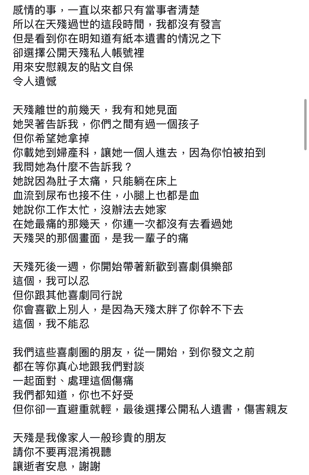 不過,林妍霏隨後IG發文表示,在感情的事,一直以來都只有當事者清楚,所以在天殘過世的這段時間,她都沒有發言,但是看到賀瓏在明知道天殘有紙本遺書的情況之下,卻選擇公開天殘私人帳號裡用來安慰親友的貼文來自保,令人遺憾。