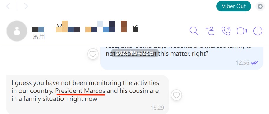 截圖內容還顯示,彭姓男子曾要求馬可仕家族派人前往香港面談協商賠償事宜,並警告若問題未獲解決,將公開更多相關資訊。不過對方回應稱,家族方面擔心任何前往香港會面的人可能遭到逮捕,因此未安排相關行程。