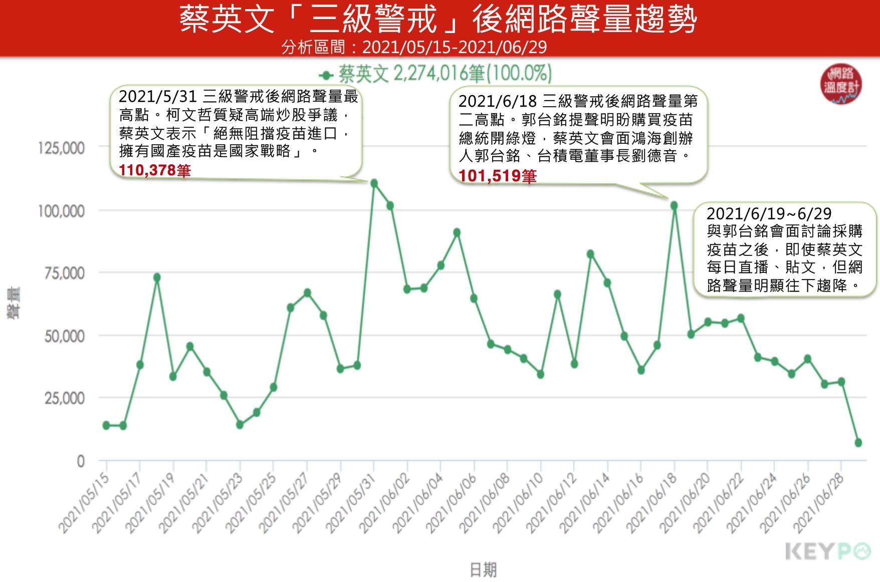 蔡總統的網路聲量最高峰落在5月31日,共有110,378筆,主要因為台北市長柯文哲質疑高端疫苗炒股,蔡英文總統臉書直播說明,創下高聲量,即使影片為事先錄製,無法與網友、媒體記者雙向互動,但攸關疫苗與生命安全,當天網路聲量還是衝到高點。 網路聲量第二高則是6月18日,總計有101,519筆,當天上午郭台銘臉書貼文表示希望政府開綠燈,協助疫苗採購事宜,文章一出,果然引起相當大熱議,使得蔡英文於下午時間,立刻安排與鴻海創辦人郭台銘、台積電董事長劉德音會面。從這兩個網路高聲量點來看,疫苗議題討論熱度相當高,顯見民眾關心、在乎的議題皆繞著疫苗轉。 不過,從6月19日之後,蔡英文的網路聲量幾乎可說一路往下降,其中19日到29日之間,總共發出16篇貼文,開了至少3場以上的直播,甚至還安排與新聞主播連線對話,但聲量似乎就是無法明顯拉抬。