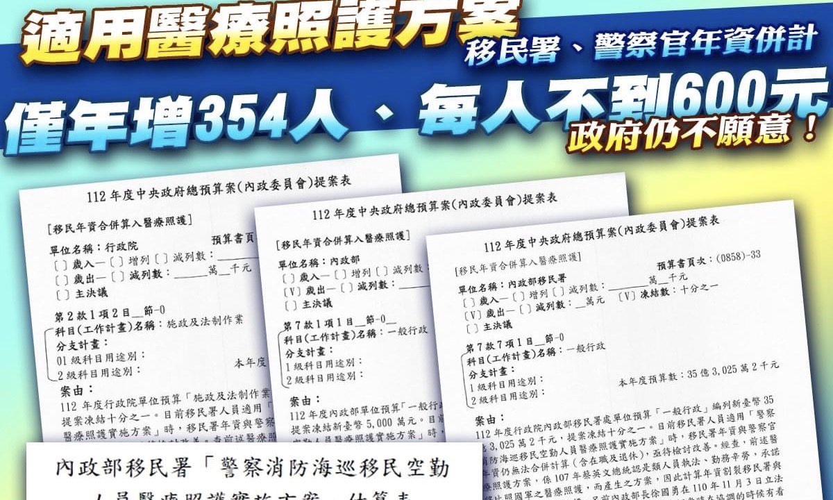 108年「警察消防海巡空勤人員醫療照護方案」上路實施,警消等執法人員醫療照護比照國軍人員,卻竟漏掉移民人員。在我多番堅持爭取後,110年11月終於納入移民人員、修正方案名稱。