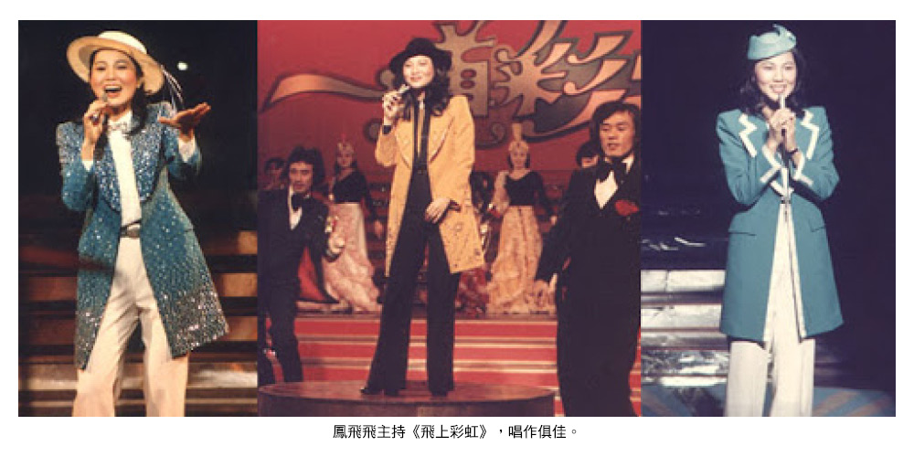 鳳飛飛不僅是歌手,也曾主持過大型綜藝節目,「飛上彩虹」至今仍為人津津樂道。台灣綜藝節目先以歌唱節目的形式出現,最著名的有「群星會」,還有1970年代初期崔苔菁主持的《翠笛銀箏》,他們把節目拉到外景拍攝,介紹台灣各地風光,搭配歌星們在風光明媚的水山間演唱,受到觀眾歡迎。