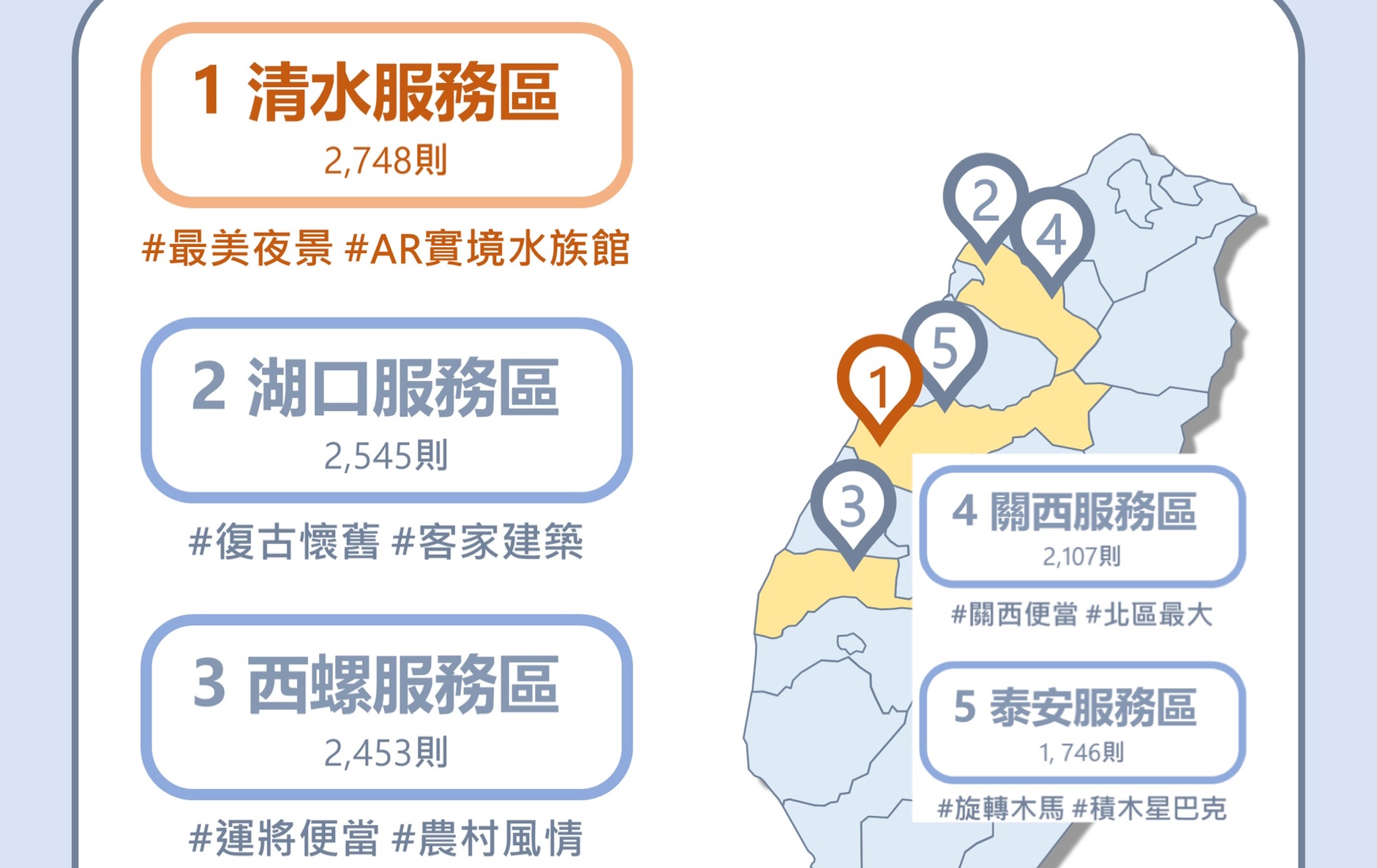 觀察網友熱議的國道服務區,可發現「清水服務區」廣受民眾討論,更被許多民眾譽為「最美休息站」,且因清水服務區位於大肚山緩坡上,具有良好視野,就有網友提到「清水休息站夜景真的美,交通又很方便,不用開山路」,表示該服務區是賞夜景的好去處之一,也推薦給想看夜景的民眾參考。此外,清水服務區近期也推出「與鯊共舞」的AR虛實展演活動,透過AR技術讓觀眾可近距離認識各類海洋生物,讓許多家長大推「帶小孩去很不錯,兒子超開心」,可見搖身變成虛擬水族館的清水服務區著實引發民眾關注。