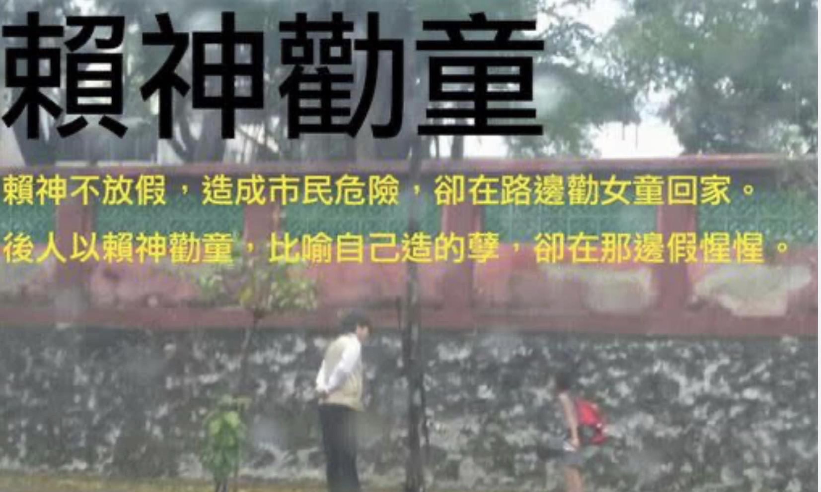 再跟大家講一個小故事,2016年9月某天台灣因颱風狂風暴雨,時任台南市長的賴清德,做出錯誤決策,早上不放假,將學童置於危險之中,等到學生上了半天課才宣布放假。
