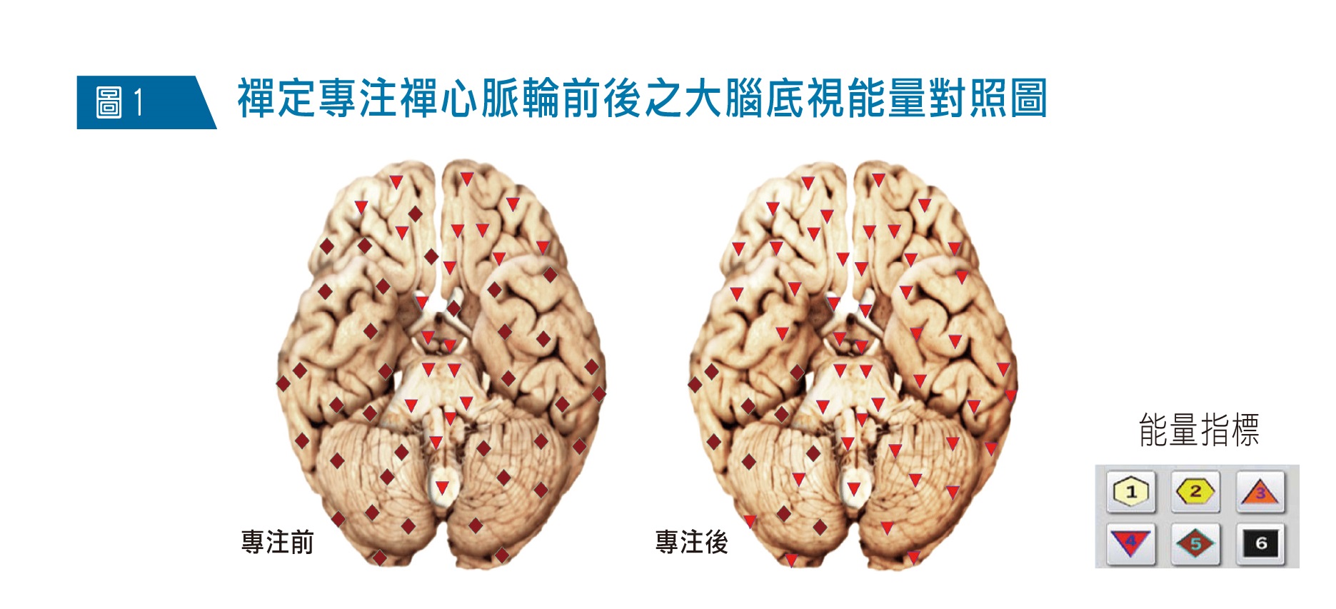 國立交通大學羅佩禎教授利用腦電波分析禪定者與放鬆休息的非禪定者的腦電波資料,發現禪定者的腦波約有2/3的定位源是落在前腦(額葉)深層區;而在休息狀態下的非禪定者,其腦波定位源則有50%落在左頂葉區及左枕葉區。