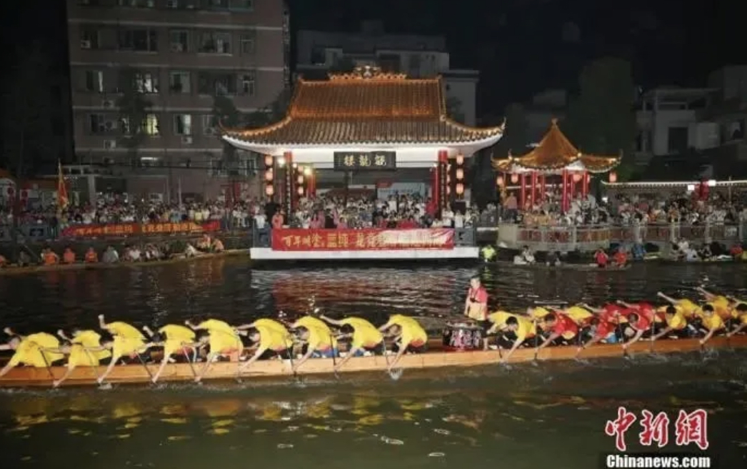 5月25日晚,廣東省佛山市疊滘村龍船在狹窄河道上進行夜間訓練。圖/取自中新網