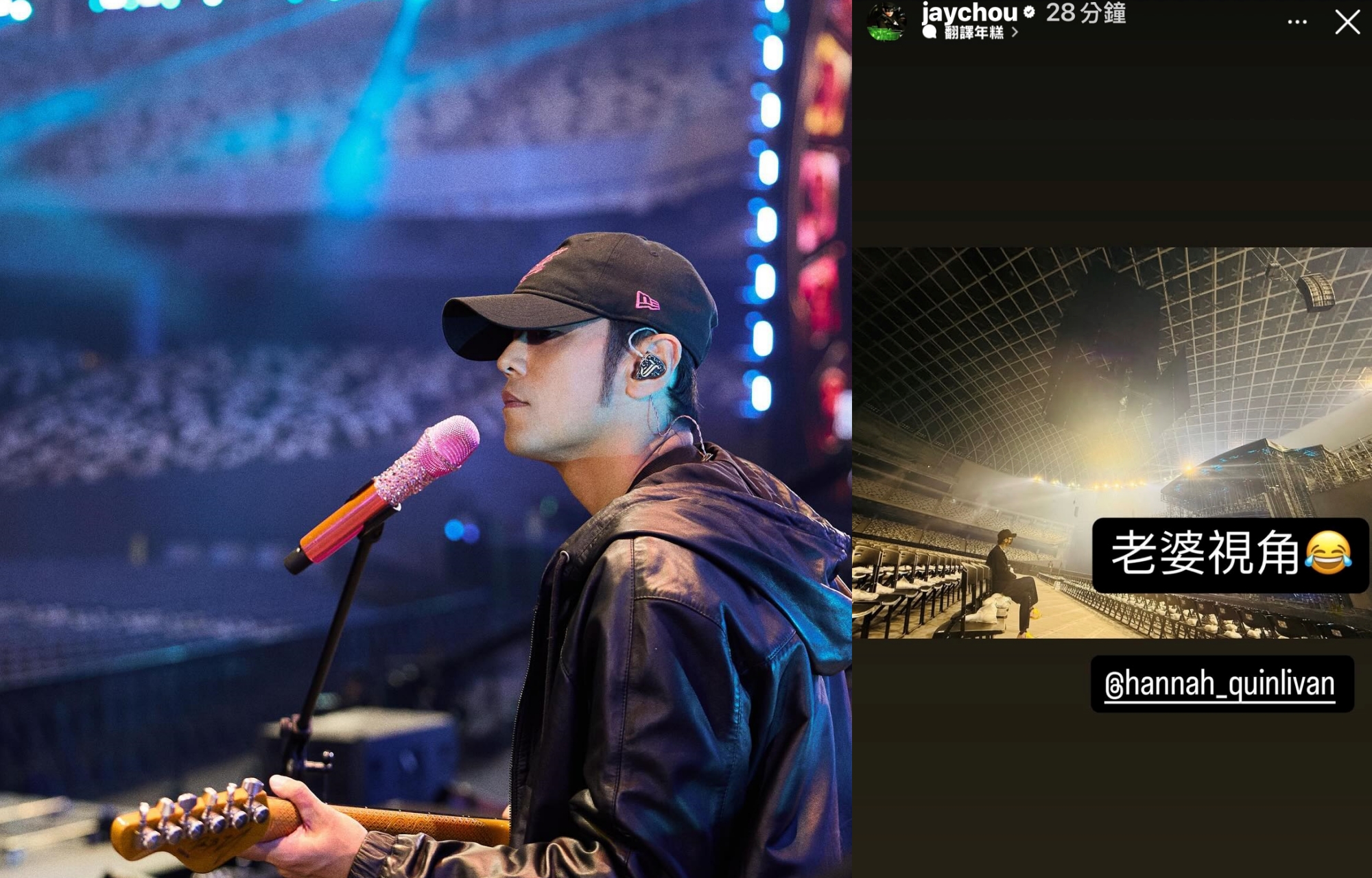 周杰倫除了在台上彩排,也坐在大巨蛋觀眾席體驗,他在限動就PO出一張「老婆視角」,而昆凌也轉發表示:「認真的你,忍不住偷拍一下。」昆凌還PO出2人合照並寫下:「Just enjoy yourself! U da best!」(盡情享受吧!你是最棒的!)。