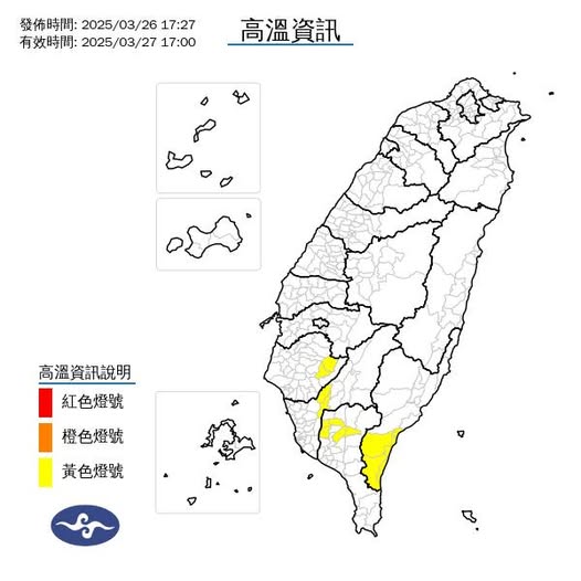 氣象署針對4縣市發布高溫資訊,下午5時前包括台南市、高雄市、屏東縣與台東縣為「黃色燈號」,有出現攝氏36度以上高溫的機會,台東縣有焚風的發生機率。
