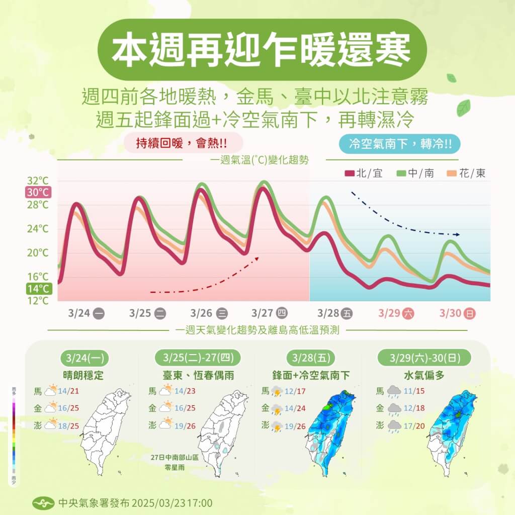 氣象署表示,今天西南風再增強,各地溫度再略為上升,也是近期最後一天的好天氣,周五(28日)鋒面通過、接著東北季風增強,北部開始降溫,白天高溫約攝氏20至22度,中南部仍近30度,整天仍是降溫的過程。周六(29日)至下周三(4月2日)受東北季風影響,各地偏涼,北部、宜蘭低溫約15、16度,中南部、花東約17至19度;高溫部分,北部約18至20度,中南部約25度上下。