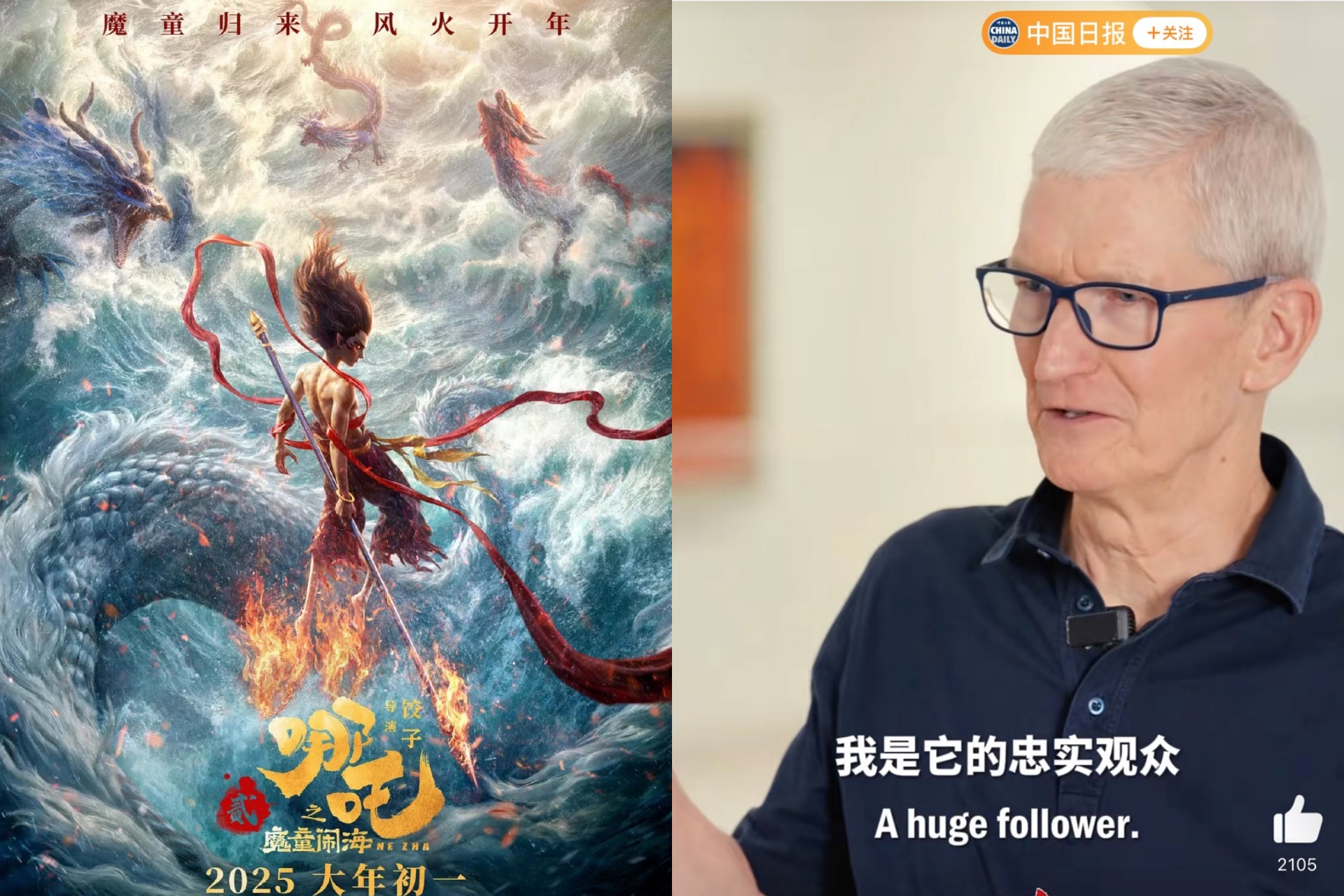 美國蘋果公司執行長庫克(Tim Cook):「我是《哪吒之魔童鬧海》(以下簡稱《哪吒2》)的忠實觀眾」。