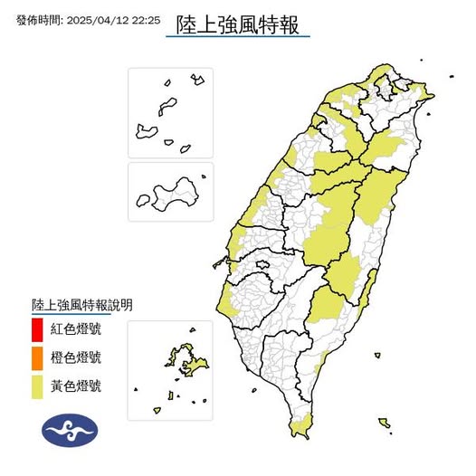 環境風力偏強,氣象署發布陸上強風特報,包括基隆市、台北市、新北市、桃園市、新竹市、新竹縣、苗栗縣、台中市、南投縣、彰化縣、雲林縣、嘉義縣、臺南市、屏東縣、台東縣、花蓮縣、宜蘭縣與澎湖縣局部地區為「黃色燈號」,有平均風6級以上或陣風8級以上發生的機率。各沿海地區、離島以及山區都要留意會有較強陣風,海邊或山區活動也請注意安全。