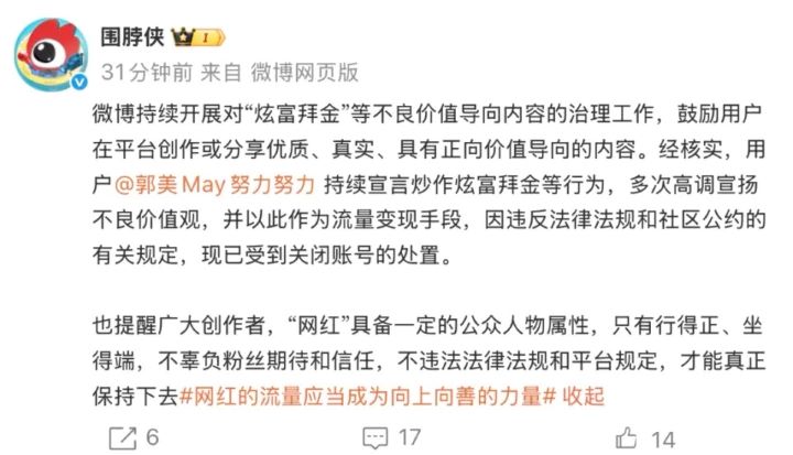 微博@圍脖俠表示,該帳號長期炒作高調炫富、拜金等內容,並以此作為流量變現方式,已多次引發負面影響。平台強調,創作者具備一定公眾人物屬性,應遵守法律法規與平台規範,「行得正、坐得端,才能長久經營」。