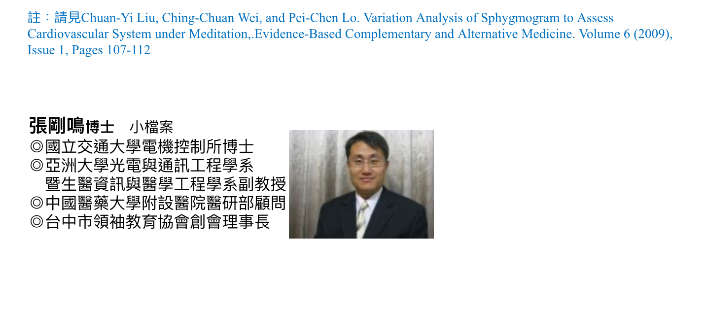 羅教授的研究,是以壓力感測儀器量測受測者手腕「寸」的位置,並記錄其血管壁動脈壓力波的變化。她找了平均年齡25歲、禪修3年以上的禪定組,與另外同年齡的非禪定對照組共20人,一同參與這項實驗。
