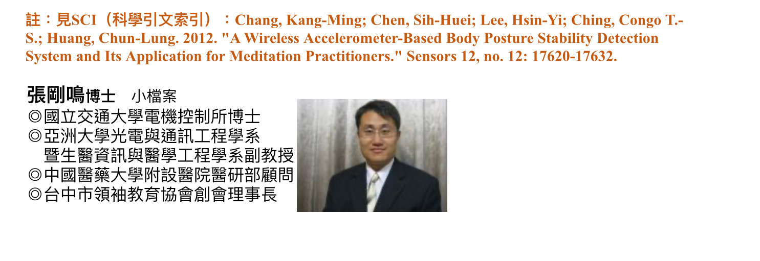 近年,我的研究團隊曾針對學習禪定的學生做過一個研究,主要是想了解他們在禪定過程中的身體穩定狀況。我們找了30位受試者,測試每人禪定時的身體晃動比例,以了解他們身體的穩定程度(註)。